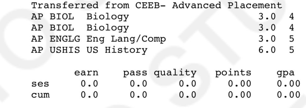 I'm applying through the NursingCAS for a few programs and am coming across an issue. I️ took four AP classes in high school and then sent them to my college. The AP courses appear on my college transcript, with a credit value next to them and they're listed as transfer credits. However, at the bottom of this section, it has a total of 0 credits totaled, even though there were almost a total of 16 credits listed above. I️ understand this as I️ did not get college credit for these classes, rather they let me skip ahead and fulfill requirements. However, I'm not sure how to enter this into the NursingCAS. I️ don't want this to hold up my application. I️ have attached a picture of what this looks like.