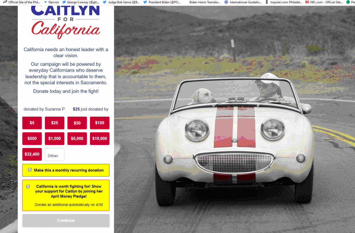 Only know their LGBQT stance.... Has name recognition. Unsure if enough conservative positions for California Republicans to support her in such a blue state. Above picture (wealth to have such a vehicle, why need my money) might dissuade some from supporting candidate.