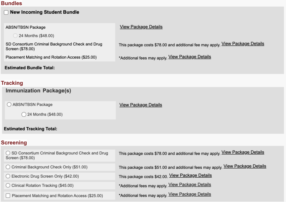 According to the email I received they want the tracking package and the background check so to me the options would be the first one under screening and the first one under tracking. However the same email has a link to the student learning info and it says the new student bundle so it is great how confused they are