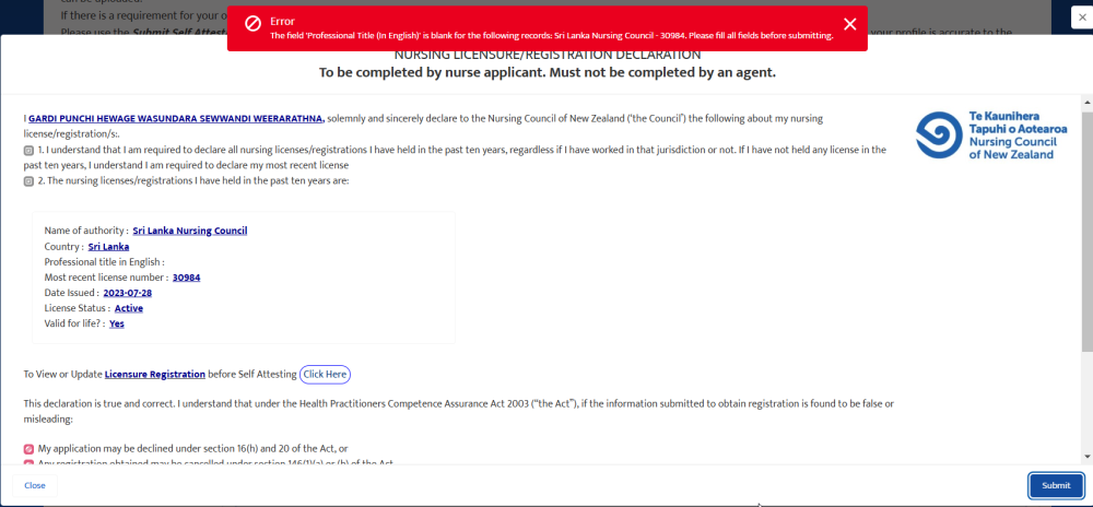 "The field 'Professional Title (In English)' is blank for the following records: Sri Lanka Nursing Council . Please fill all fields before submitting."