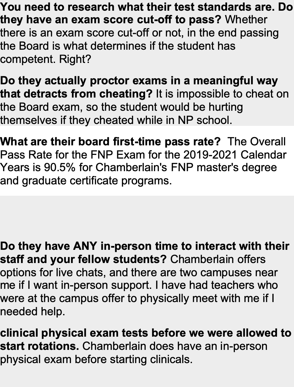 OK, hybrid or not, what I mean is Chamberlain offers the flexibility to complete classes online and the clinical portion is hands-on. If the boards don't mean anything, then are you saying that all NPs who pass the boards are really not adequate because it is easier than the NCLEX? Can you clarify this? Yes, maybe the MDs do not completely understand the NP curriculum etc., but they were speaking from what they actually experienced. I'm sure other MDs may have had negative experiences. Not all bad or good experiences come strictly from Chamberlain grads. I have done my research before choosing Chamberlain. It does have CCNE accreditation, options for live chats, two campuses near me that I can use for resources, preceptorship placement support, and a lot more. As far as finding preceptors, I'm glad I have the option of finding the preceptor I want to learn from. This option gives me the opportunity to find a competent NP. Brick-and-mortar schools and online schools have their advantages and disadvantages. Research shows that both options are adequate. The online NP Program fits my needs right now, and I am glad they have clinicals where I can get hands-on experience. Again, passing the boards and providing competent care is what matters. I appreciate your feedback and I have made my choice after researching the various options available. We can agree to disagree. :).