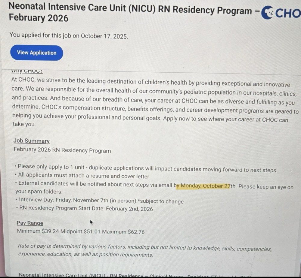 Starting a thread for those of us who applied to CHOC's new grad program for their February 2026 cohort. Goodluck to everyone that applied!