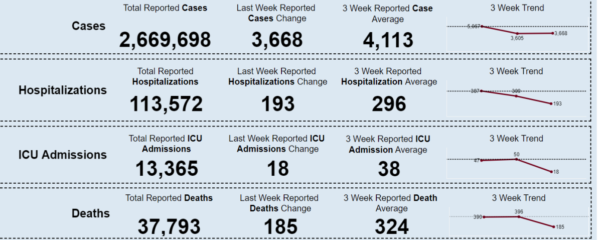 Expect new state numbers today for last week as they are no longer reporting daily. General mask mandates lifted. We continue to mask in public areas but can remove masks in offices, conference and break rooms. Anticipating masking with direct patient care for the foreseeable future.