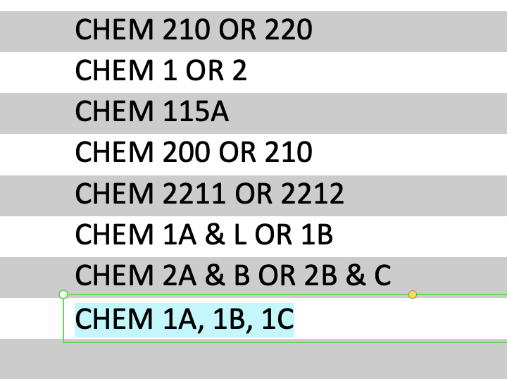 Actually, CSULB wouldn’t even look at my general Chemistry class because they require your Chemistry class to be a combo of two different types of Chemistry, right?