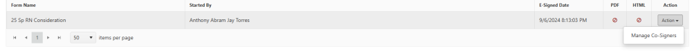 When you go the the Health Science app website and access prior applications, click on "Forms awaiting signatures" and then click on actions -> manage co-signers -> it should show you who e-signed your applications.Â