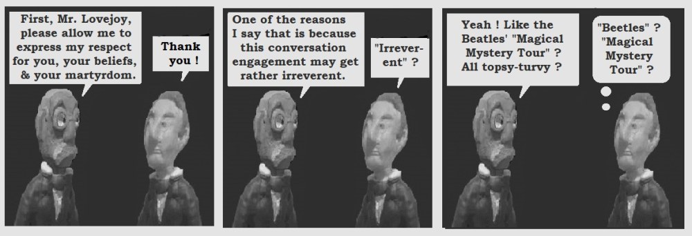 When it comes to art, I'm all over the map, from feeling serious & sublime to irreverently humorous and silly. These are a few of GIFs, the first being an introduction to a cartoon interview series with Mr. Lovejoy.