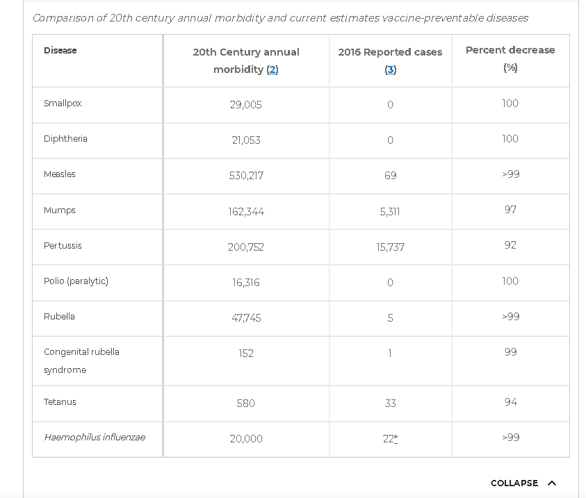 QuoteFew measures in public health can compare with the impact of vaccines. Vaccinations have reduced disease, disability, and death from a variety of infectious diseases. For example, in the United States, children are recommended to be vaccinated against 16 diseases (1). Table 1 highlights the impact in the United States of immunization against nine vaccine-preventable diseases, including smallpox and a complication of one of those diseases, congenital rubella syndrome, showing representative annual numbers of cases in the 20th century compared with 2016 reported cases (2, 3). All of the diseases have been reduced by more than 90% and many have either been eliminated or reductions of 99% or more have been achieved.