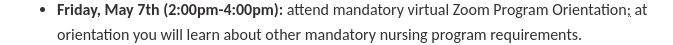 When I emailed --------------------, she asked to wait until the orientation meeting in May to get the other required items (ie, CPR cert, fit test, etc) taken care of.