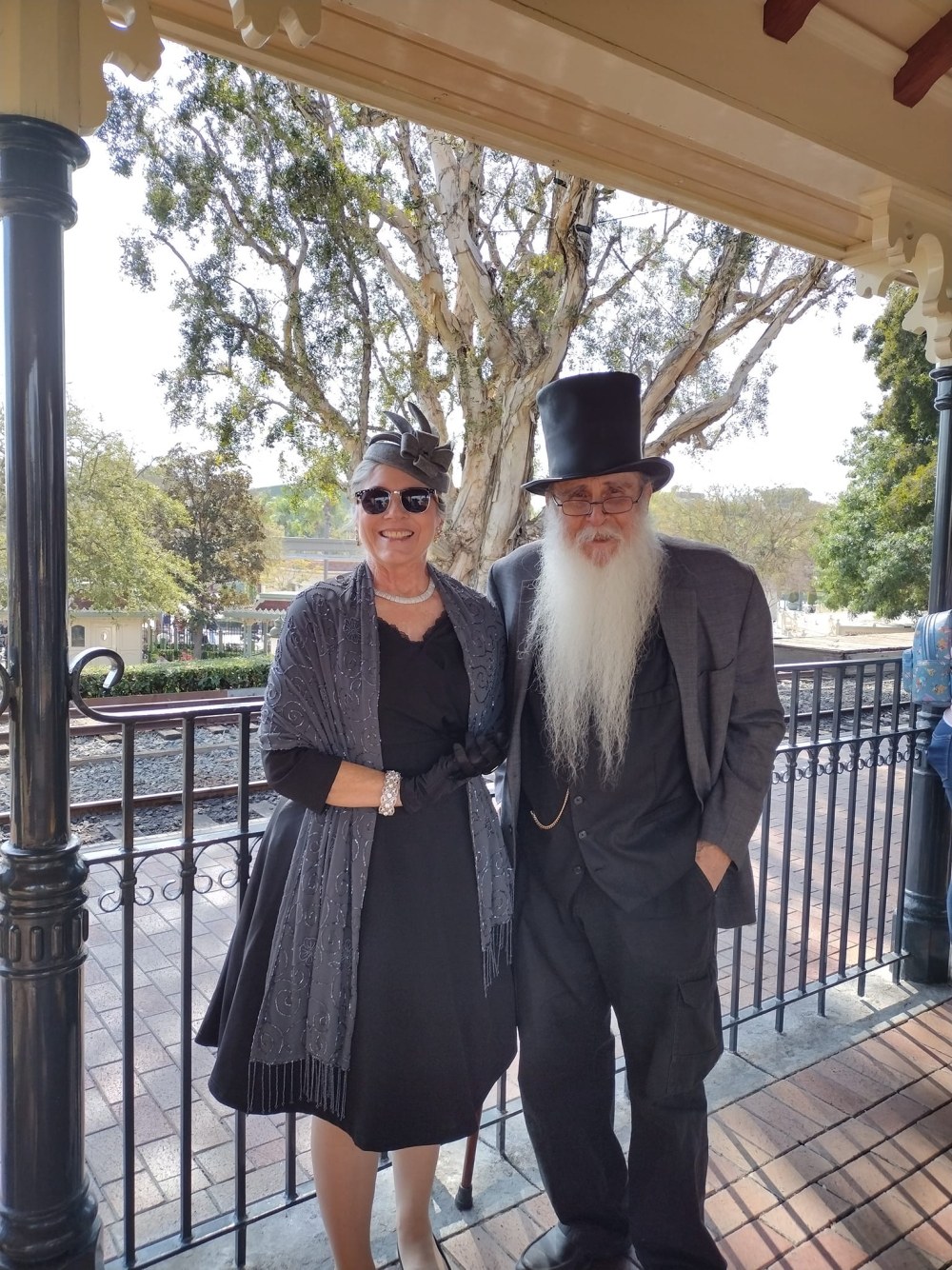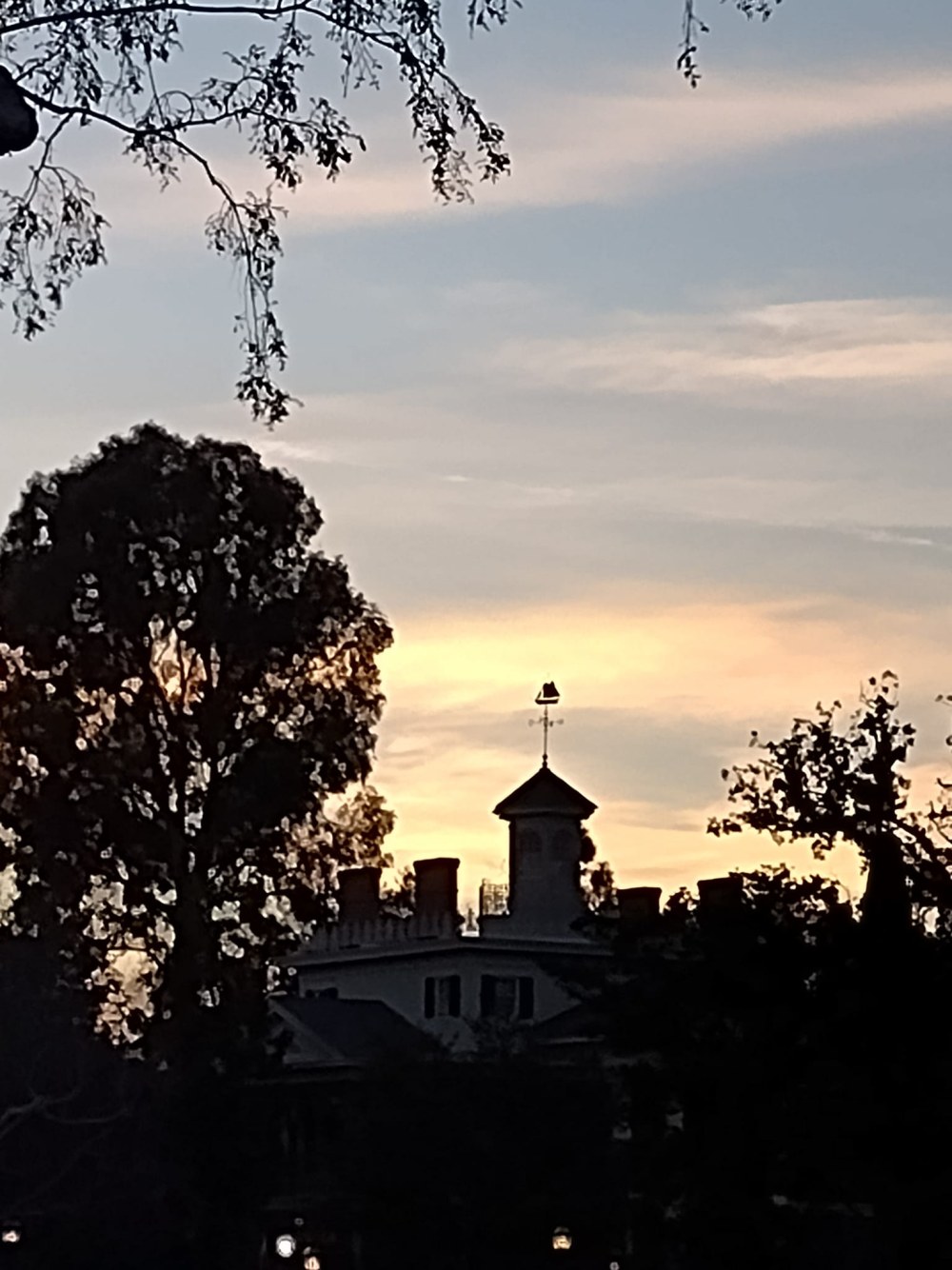 Here are a couple photos: the Columbia on the Rivers of America, the Columbia and then the Haunted Mansion (down for refurb) at dusk, and one of us, dapper: