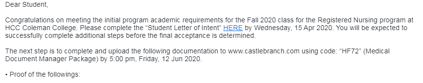 I applied on jan 2 and created a profile for HCC, didnt submit until the 10th with all the documents and got a reply on the 13th or 14 regarding "letter of intent" due the 15... then got an email with a to-do list ... at the same time I read somewhere was a session meeting today the 20th on mlk .. showed up and school was closed... and i couldn't find that msg anymore... this is driving me crazy.