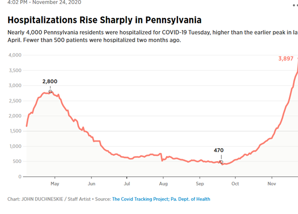PA expected to run out of ICU beds by December due to rapid increase in hospitalization rates past 2 week ( av. <500 to almost 4,000 11/23) + Thanksgiving get togethers. Were seeing the coronavirus spread at large and small events alike now. On Tuesday, there were 672 COVID-19 patients in Philadelphia hospitals, up from 542 on Thursday.