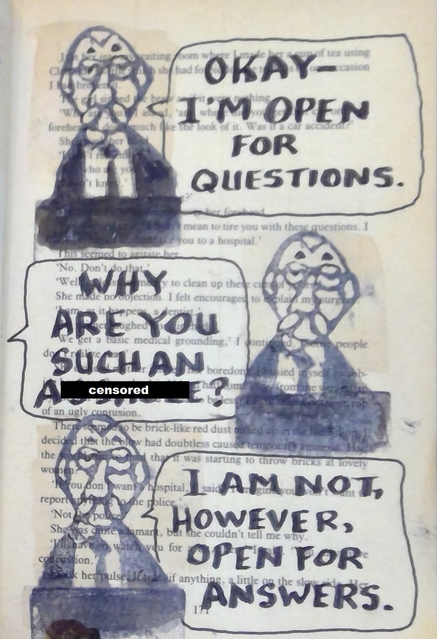 Years ago, I watched a movie where a character played by Ben Kingsley drew charcoal pencil pictures in books over the text. Thinking this was really cool, I undertook the process myself, drawing over text in relatively useless books using my art pens. I termed this process "Literary Graffiti".