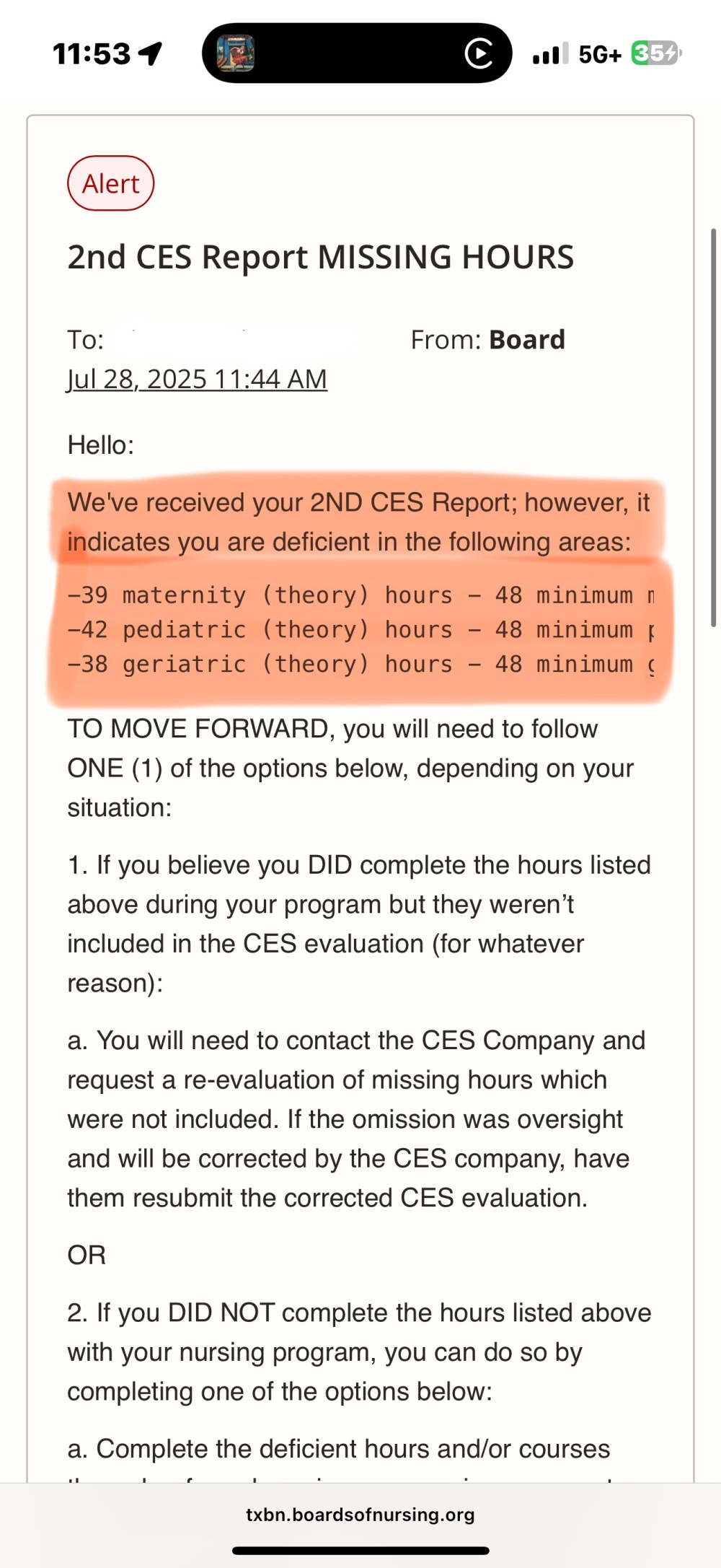 Hi guys, I'm a Canadian RN who recently relocated to Texas (Dallas) with my husband in August 2024. I'm writing this post hoping someone in a similar situation has found a solution! I'm endorsing my license with TBON, and my credential evaluation service report indicates I'm deficient in maternity, pediatrics, and gerontology theory hours (missing 6-10 hours for each course) TBON requires me to complete these hours, but they won't specify where or how to do so. I've contacted schools offering ADN degrees without success and feel lost. Has anyone encountered this issue and found a solution? I'm grateful for any help or direction ❤️.