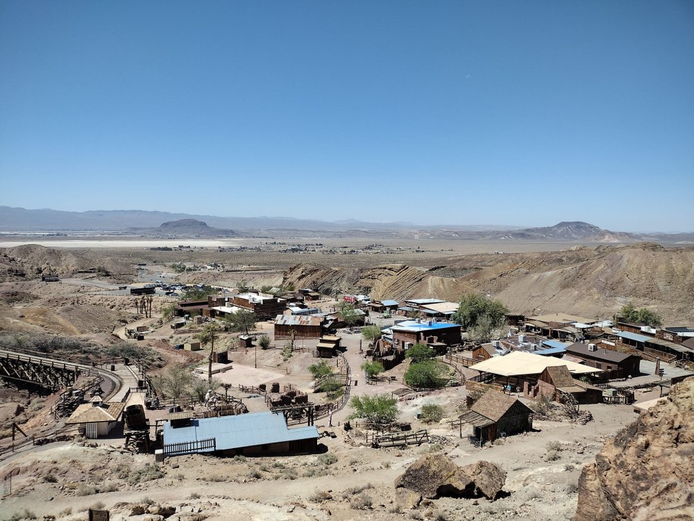 Some old cabins and walls still remain, as do several mines and vestiges of crude ore processing. It was a silver producer for about 14 years, then switched to borax for a bit before fading to "ghost town" status. It was purchased by Walter Knott (yes, of Knott's Berry Farm fame) in the 1950's and some of the buildings were restored. He then gifted the land to the County, and it still holds County/Regional Park status.