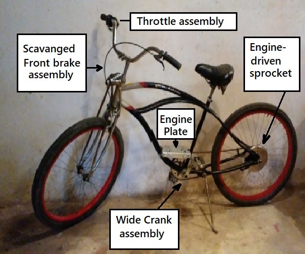 From left to right: I added a front brake for safety once the bike is motorized. Along with the back coaster brake, I should have pretty good stopping power. However, should the pedal-driven chain should fall off, I could still stop with the front brake.