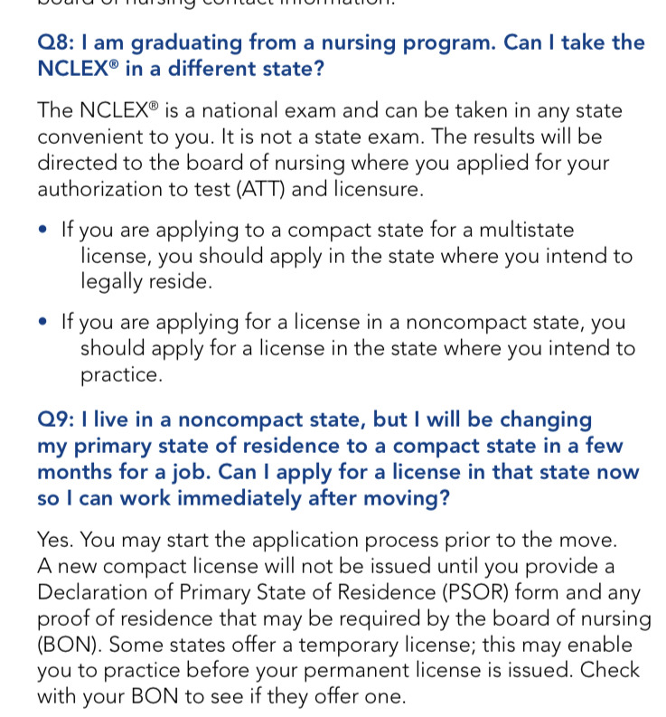 The NCLEX can be taken in any state convenient to you. The results will be directed to the board of nursing where you applied for your authorization to test (ATT) and licensure. If you are seeking a multi-state license and reside in a compact state, you should apply for a license in the state where you intend to legally reside and/or practice.