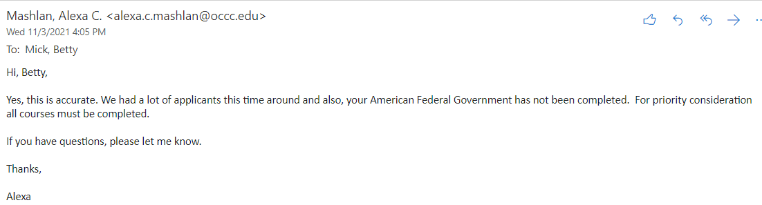 1 hour ago, BettyM said:Update: Pretty sure there IS a mistake... My response says they have me in tier 2 b/c my American Federal Government isn't completed!! ? Any of you who know all these requirements in your sleep like those of us who are on our second or more round of application will recognize this mistake... That class is NOT a pre-requisite, in fact is to wait and be taken concurrently with the final nursing class in the last semester! I've attached my note the person sent me saying I'm tier 2 b/c I haven't done this class. I of course, responded immediately and asked that a supervisor review her work, and attached pictures from the actual requirements for her reference. If any of the rest of you are questioning your notification level, by all means speak up, because there apparently is a lack of experience in at least the person talking with me....