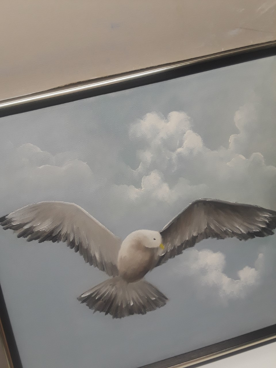 This is a painting I did as a kid in the early 70's. The inspiration was the book "Jonathan Livingston Seagull". It is about a seagull that strives for independence, flight, and to be one's self in light of what the rest of the flock thinks. It speaks to the emptiness of materialism, the need to accept others regardless of differences, and the need to always and continually strive for and choose love. The original book was first published in 1970 with 3 parts and the author later added a 4th. I think we would all do good to follow these principles. I gave the painting to my Mama because she also liked the book (she read it first) and later got it back after she died. It is special to me.