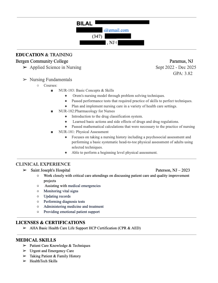 I'm currently a second year nursing student looking for a PCT job. Can you take a look at my resume and give me some advice on how to make it better or if I need to change anything?