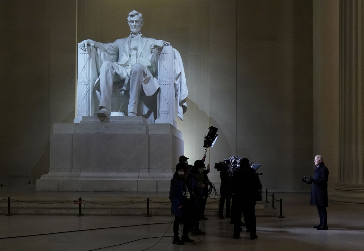 6 feet away from masked TV crew filming at nighttime Inauguration Eve President removed mask so citizens can clearly hear his important thoughts.