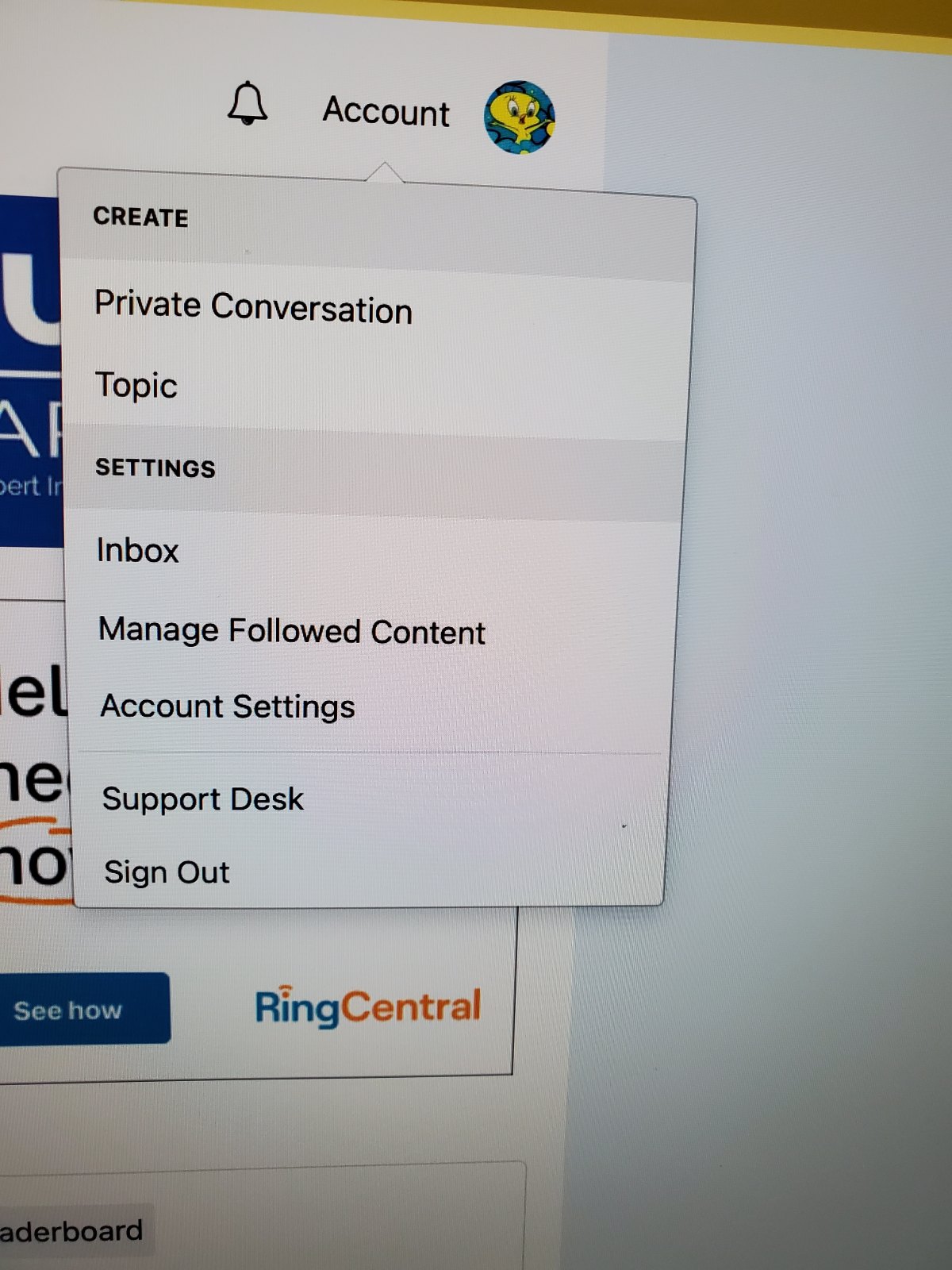 My drop down looks like this and the account settings don't seem to have anything about ignoring people.
