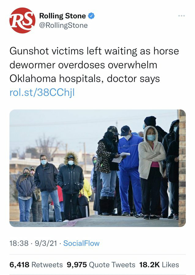 On a personal note, my hubby works for a farm store and has overheard customers explaining to each other how to dose animal wormer for people. This is in a community that is anti-mask, anti-vaccine, let's just all get infected. Up until, you know, they need hospitalization .