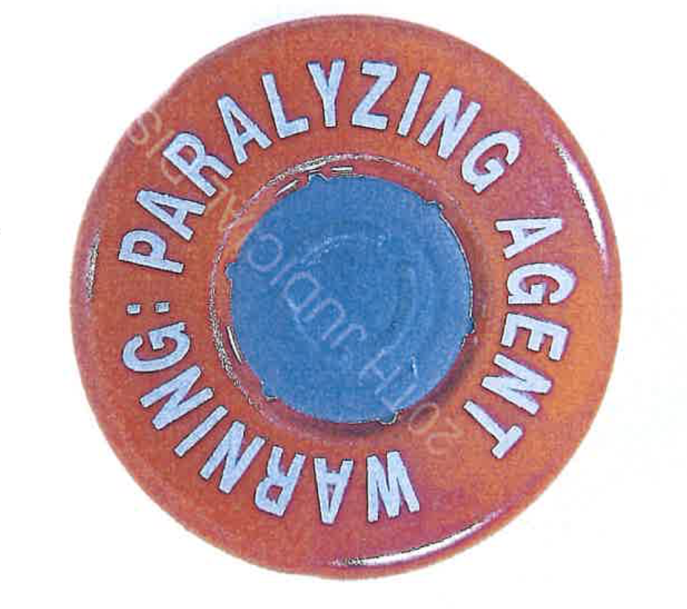 Vercuronium, in a glass phial with a red top, and needs to be reconstituted. Has a large warning "paralytic"
