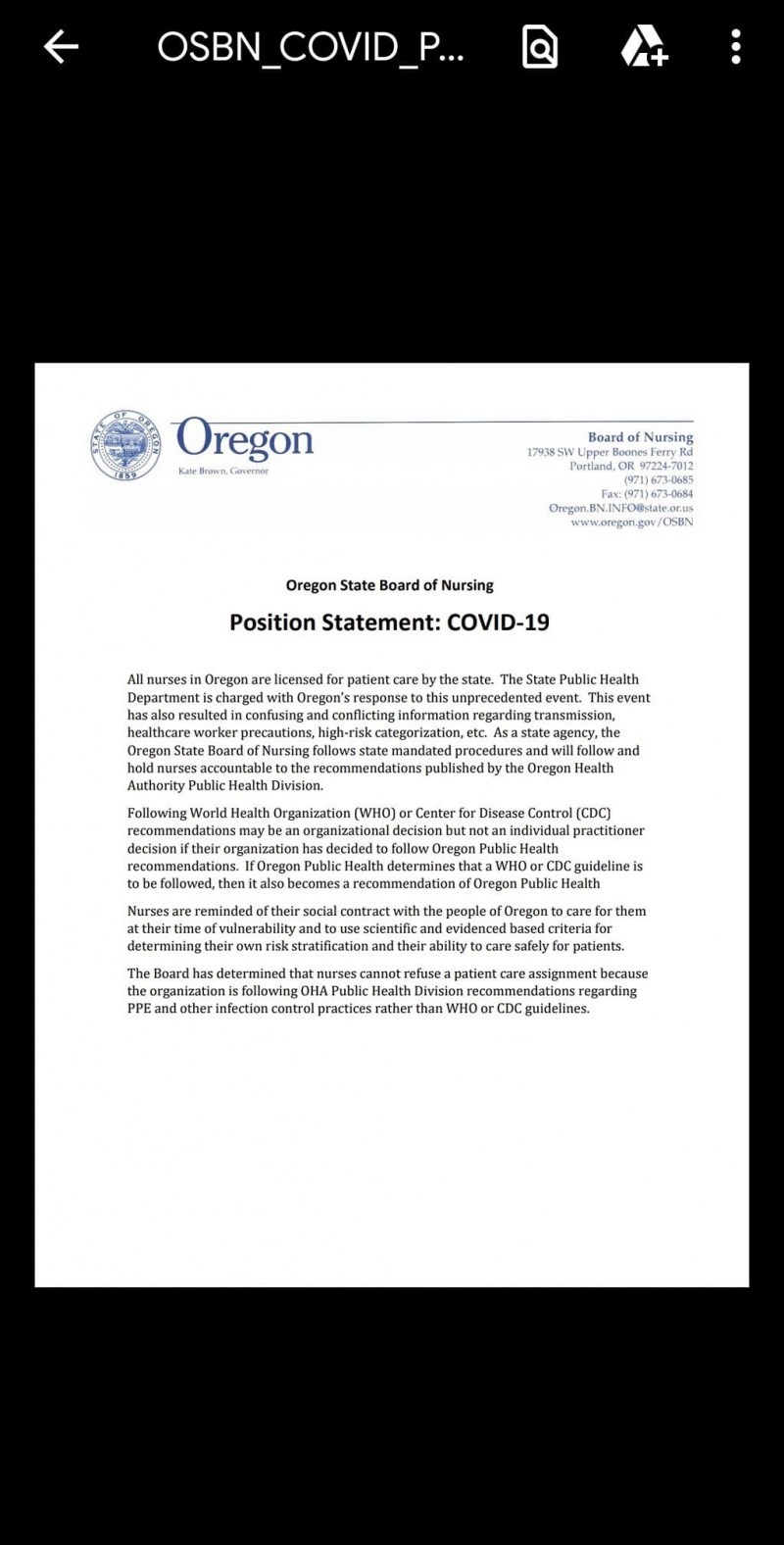 The Oregon BON is concurring with Oregon Public Health, which has taken the position that even if N95 or better protection is available, the recommended level of protection for nurses caring for Covid-positive patients is procedure or surgical masks, which is not supported by any current evidence.