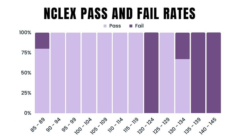 As the NCLEX is a computerized adaptive test (CAT), it will stop administering questions once it is 95% sure whether a student will pass or fail. When looking at data, the following pass and fail rates are according to when the test shuts off.