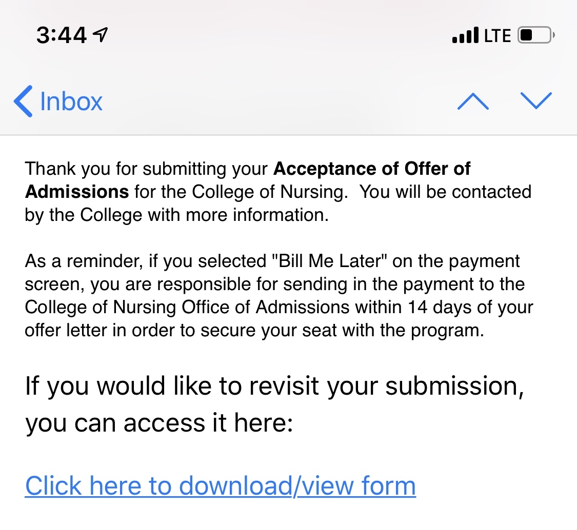 Once you’re logged in, the offer of admission form should be under “College of Nursing Admissions.” (It’s disappeared from my account, but I’m 90% sure it’s there.) You’ll need to complete that. If my memory serves me right, that offer of admission form is also where you upload your two forms of ID.