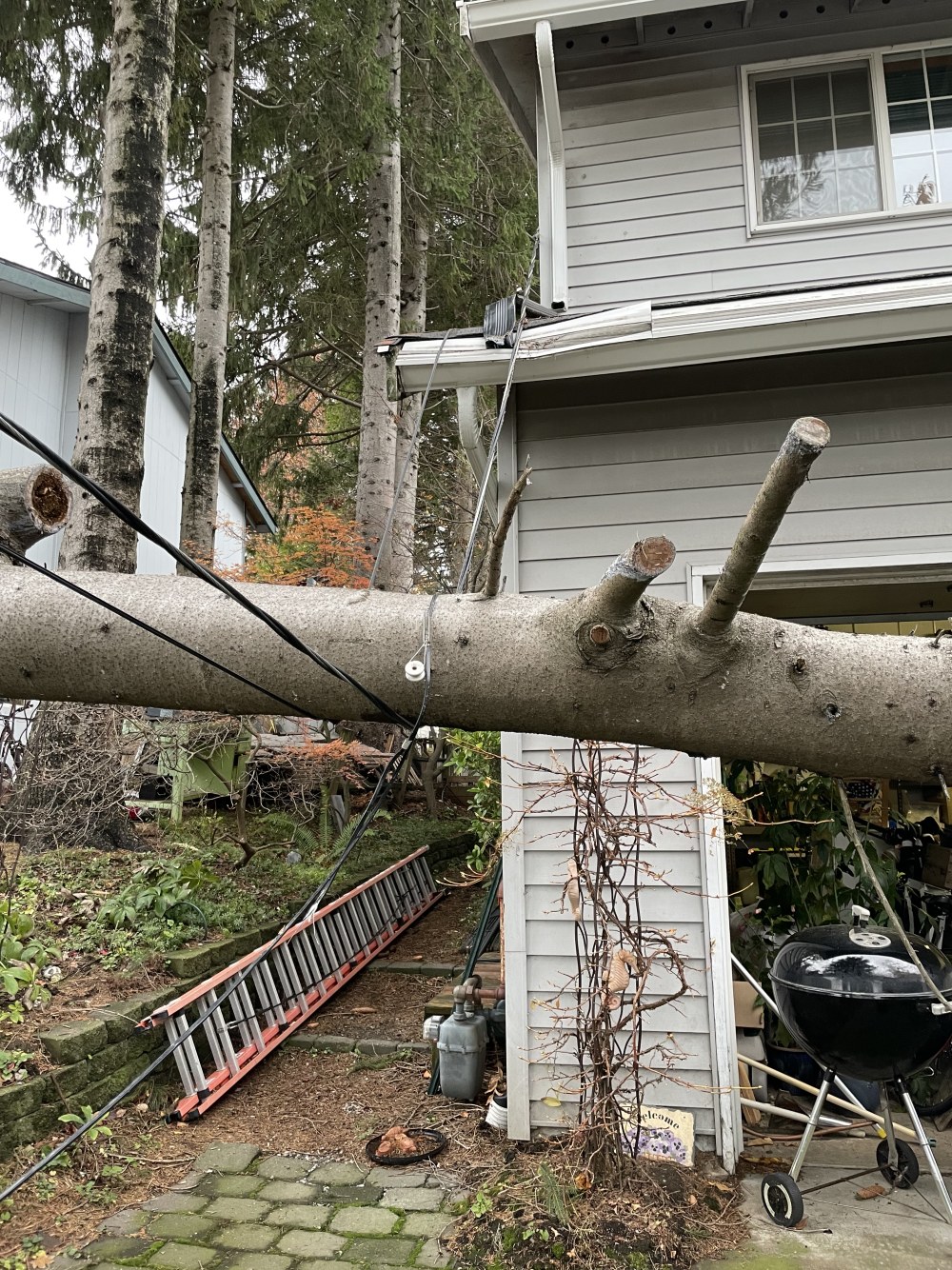Hi. Went to sleep with very windy weather and woke up to a loud crash at 230 am. One of the neighbor's spruce trees broke off and fell into our driveway, damaging some of the roof gutter and landing on the power lines, pulling them away, but not off the house and the pole. I called the power company and someone was just here to look and put in the request for someone else to actually come out and do something. The guy talked to dh so I only caught the end, and dh had me all confused explaining what has to happen. Someone will take down the line, and leave it until we can get an electrician to make repairs on the house. Or maybe they will do a temporary fix on the house. And maybe we should turn off the main breaker. Or not. And we should call the cable company, except there is still a live electrical line holding up a tree next to the cable. If we have to turn off the power we will need to stay in a hotel that takes dogs. Anyway, I called the insurance company to start a claim, just in case there is a dispute about who the tree belongs to.