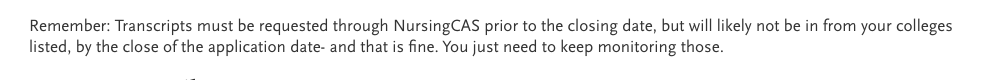 8 hours ago, Lone_purple said:Hey! Well, I know that the official transcripts have to be submitted to NursingCas for the application to be complete (they just need to be sent to nursingcas before the time of application). The transcripts need to be sent to SJSU as well, but the deadline on my SJSU account was reflecting that those aren't due till July (so basically you can wait until you know you are accepted).