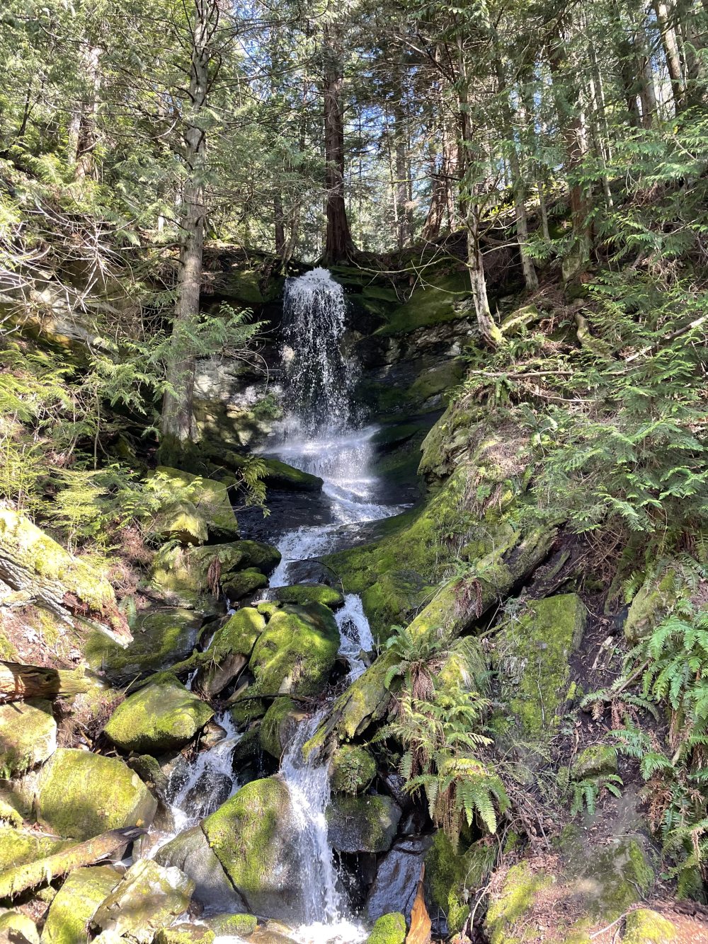 Good morning. We had a long day yesterday. We spent about 4 hours at the trail race that DIL ran, as we moved between 3 different points to cheer her on. We hiked up a trail about a mile initially, waited a bit, then back down, and waited a short while. Then we drove to a convenience store for snacks and water, and then waited at the finish for her. She finished a 50K (32 miles) over some steep terrain and came away with sore legs and a blister on one foot. Then we stopped for Mexican takeout then home to eat and I fell asleep. And I am sore today! I am including a picture of a waterfall that we passed as we climbed to the first spot. We just go home from breakfast at a local, but not our usual, diner. It was okay, but I miss the crispy waffle I usually get. Our favorite place is reopening after being closed for 4 weeks for badly needed renovations. Today I plan to work in my garden, if my sore legs permit.