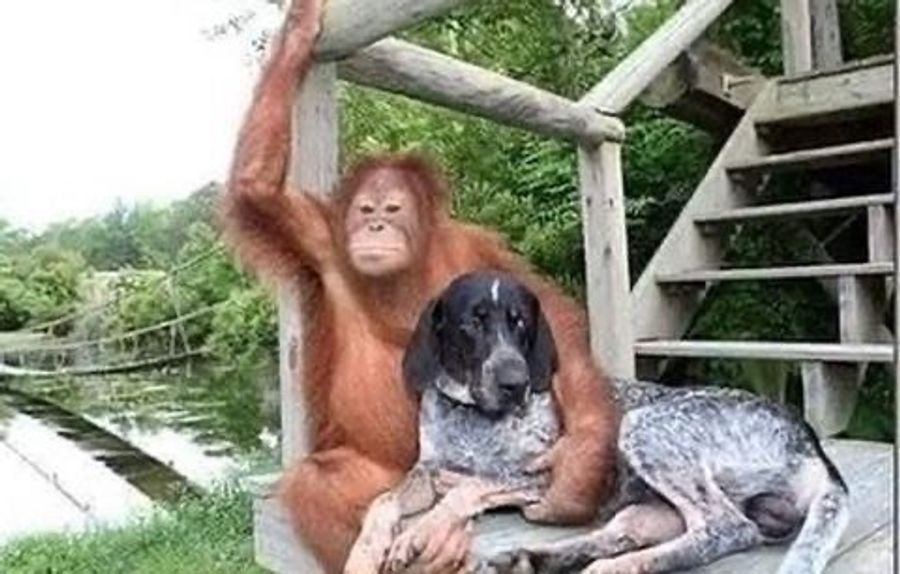 The zookeepers found an old sick dog on the grounds of the zoo where the orangutan lived and took the dog to the animal treatment center. The dog arrived at the same time as the orangutan was there being treated. The two met and have been extraordinarily close ever since. The orangutan found a reason to live and each of them always tries his best to be a good companion to the other one. They are together 24 hours a day. They live in Northern California where swimming is their favorite pastime. Although Roscoe (the orangutan) was afraid of the water, the dog has actually taught him to swim. It's incredible. The two of them are absolutely inseparable.