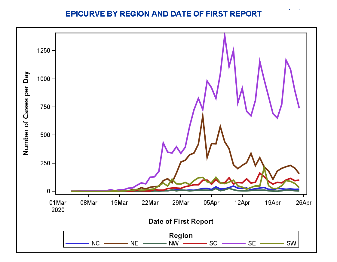 Easy to see from this graph showing # coronovirus cases/per day per differing sections of our state. Purple: SE 5 county Philadelphia area where I live and Brown: NE Pocono's region (where many from NYC have a vacation home).