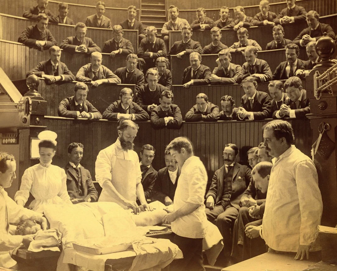 We know where this photo was taken: Boston City Hospital, one of thousands of public hospitals founded in the wake of the Civil War. Operating theaters were popular teaching spaces that offered real drama while fluffing the fame and prestige of star surgeons. We know the identity of the photographer and the stars in this play: the surgeon Herbert L. Burrell of Harvard Medical School stands to the right, and a Dr. Cheever operates on the leg of this unfortunate patient. But the nurse’s identity is unknown, probably forever lost.