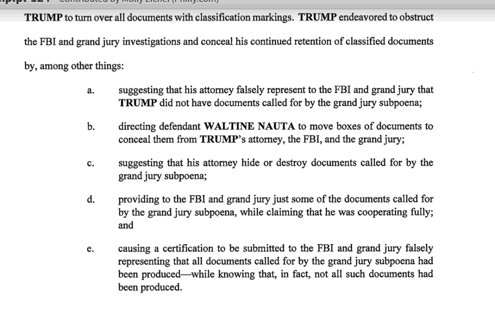 Pages 28-33 list classified and top secret documents.... also describes how Walt Nauta under Trumps direction moved 64 boxes from Mar-a Lago storage room AFTER subpoena issued. Trumps 2 lawyers after appearing on 7AM morning news shows, Jim Trusty and John Rowley have resigned.