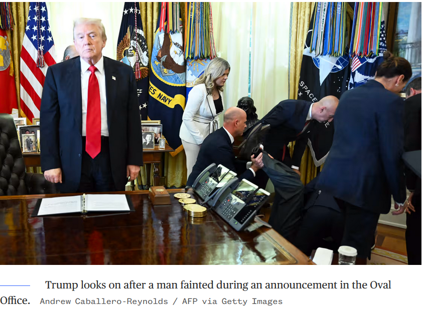 During RFK Jrs and Dr OZ presentation section, Trump repeatedly struggled to stay awake for about 20 minutes seen in the video. Later an Eli Lilly weightloss client guest in the Oval Office fainted causing the event to be cut short. Later that day, an image of Trump standing idly by as those around him attended to the man went viral. He does not look well, ? sleep deprived after Asia trip or new meds for chronic venous insufficiency...very concerning as I watched live this W.H. meeting.