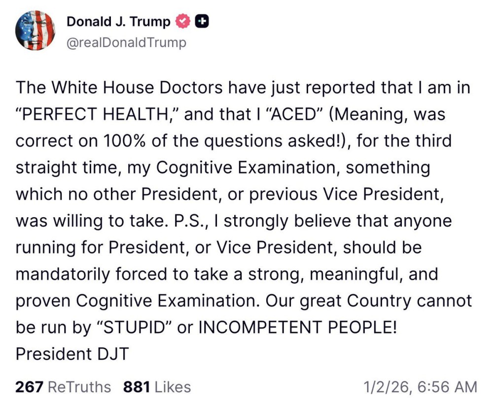 What is the current criteria for ordering and conducting cognitive tests on our patients? Is Trump having his cognitive formally evaluated more often than annually? Wouldn't that be needed if he was receiving some kind of treatment that is expected to affect cognition in the elderly? Should we know the answers to those questions?