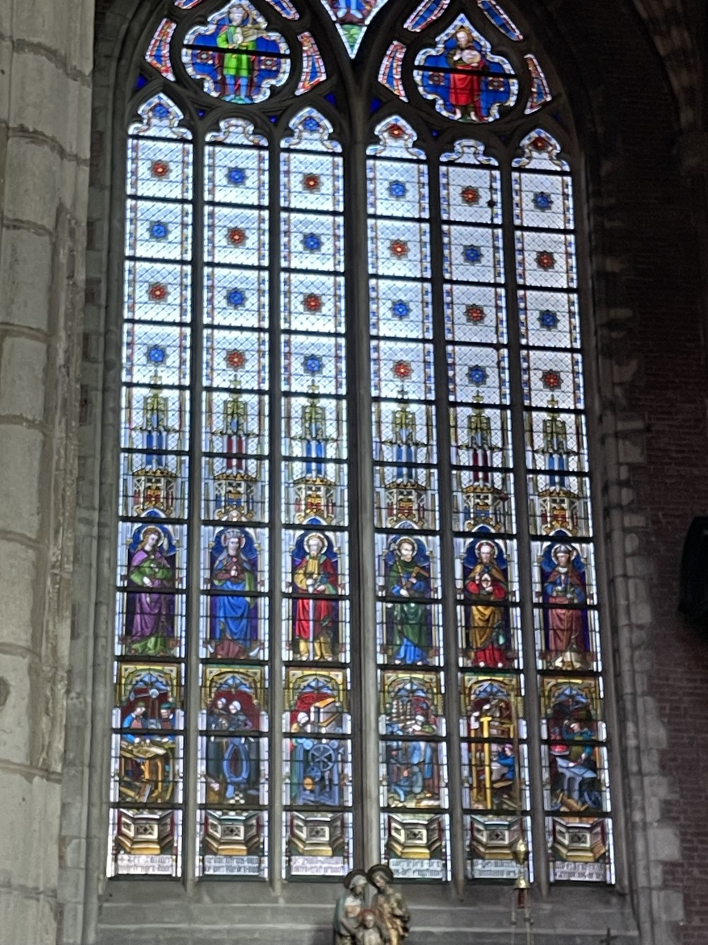 We toured the cathedral that houses the famous altarpiece of Ghent. It was featured in the movie "Monument Men". It didn't photograph well because it's behind glass, so here is a picture of some of the stained glass.