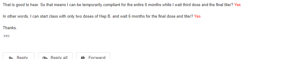 It turns out that there isn't a deadline for immunizations apparently. As long as you're in the process of completing your doses/titers, you're fine. Dr. Menard TWU's Student Health physician, told me that I can completely restart my 3 dose Hep B vaccine and as long as I initiate the series before class starts, they'll place me on "temporarily compliant". She even said I can be temporarily compliant between the 6 month waiting period for dose 3 and the final titer.![]()