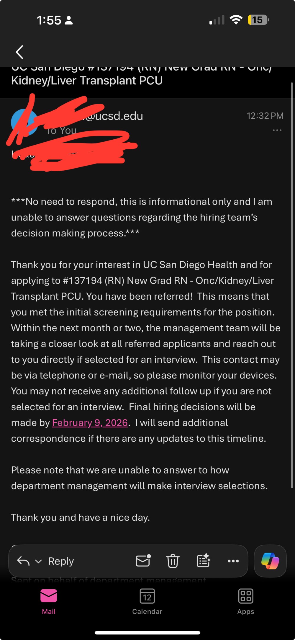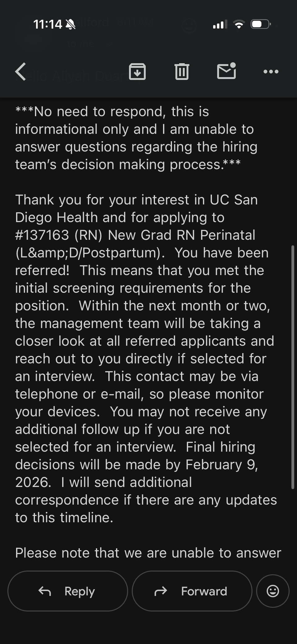 I applied before I graduated last year and got this exact same email for 6 units before they decided to cancel. This time only one unit has emailed. I knew it was going to be extremely competitive, but I am honestly surprised. I used to work at UCSD, I have every certification I could get (ACLS, PALS, BLS, Nihss), I'm an active member of the professional organization of the specialty I was interested in, I work with ANA California, I volunteer with so many non-profits, I'm completing my MSN, and I thought I was a strong candidate. Somehow I barely made the cut for one single unit.