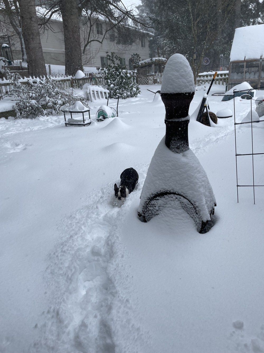 Chin-deep snow! Poor li'l dog! I had a friend once who had a Great Dane who HATED to go out in the snow. She had to go out first to take him by his collar and pull, while her kids each had to push him from behind and pull his hind legs out from the doorjamb where he would brace himself with his back legs. When they did get him out, he would immediately lift his leg to pee, and give them the stink-eye while he was peeing. It was too funny!